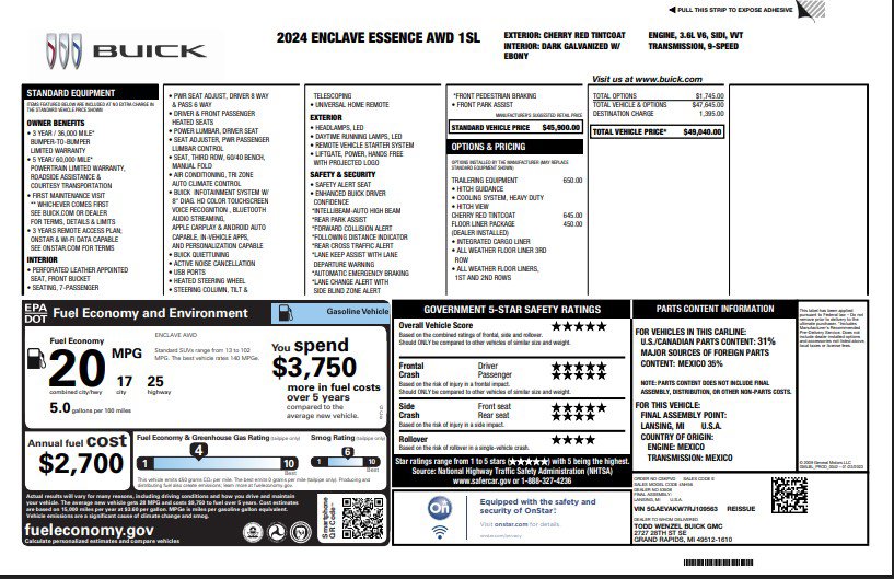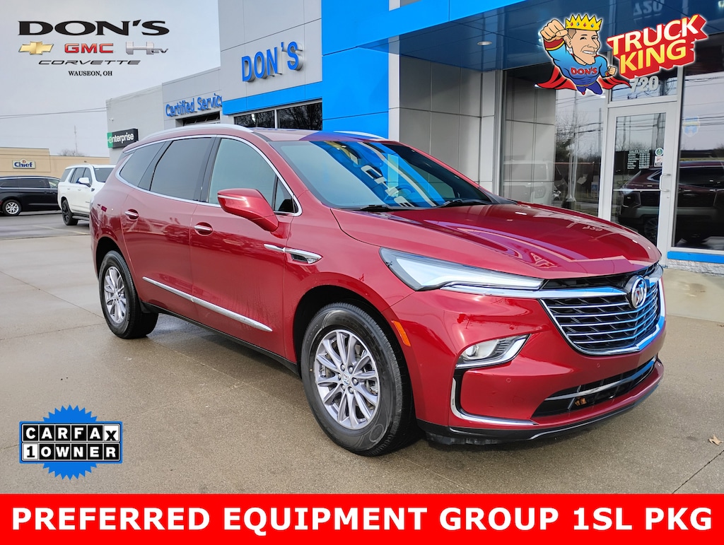 18" Aluminum Wheels, 5,000 lbs Trailering Package, 6-Speaker Audio System Feature, 6-Way Power Front Passenger Seat Adjuster, 7-Passenger Seating, 8-Way Power Driver Seat Adjuster, Auto High-beam Headlights, Auto-dimming door mirrors, Auto-dimming Rear-View mirror, Automatic temperature control, Brake assist, Delay-off headlights, Electronic Stability Control, Four wheel independent suspension, Front Bucket Seats, Front dual zone A/C, Fully automatic headlights, Garage door transmitter, Heated door mirrors, Heated Driver & Front Passenger Seats, Heated front seats, Heated steering wheel, Heavy-Duty Cooling System, Hitch Guidance, Hitch Guidance w/Hitch View, Illuminated entry, Low tire pressure warning, Outside temperature display, Perforated Leather-Appointed Seat Trim, Power door mirrors, Power Driver Lumbar Control Seat Adjuster, Power driver seat, Power Liftgate, Power Passenger Lumbar Control Seat Adjuster, Power passenger seat, Power steering, Power windows, Preferred Equipment Group 1SL, Premium audio system: Buick Infotainment System, Radio: Buick Infotainment System AM/FM Stereo, Rear air conditioning, Rear window wiper, Remote keyless entry, SiriusXM w/360L, Speed-sensing steering, Steering wheel mounted audio controls, Telescoping steering wheel, Tilt steering wheel, Traction control, Turn signal indicator mirrors, Variably intermittent wipers, Vehicle Health Management, Wireless Apple CarPlay/Wireless Android Auto. CARFAX One-Owner. Clean CARFAX.