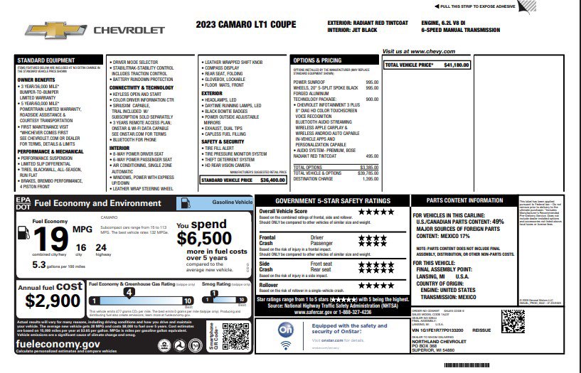 4-Wheel Disc Brakes, 6-Way Power Front Passenger Seat Adjuster, 8-Way Power Driver Seat Adjuster, ABS brakes, Alloy wheels, Apple CarPlay/Android Auto, Automatic temperature control, Bluetooth® For Phone, Bose Premium 9-Speaker Audio System Feature, Brake assist, Delay-off headlights, Driver vanity mirror, Electronic Stability Control, Exterior Parking Camera Rear, Four wheel independent suspension, Fully automatic headlights, Illuminated entry, Low tire pressure warning, Power door mirrors, Power passenger seat, Power Sunroof, Preferred Equipment Group LT1, Radio: Chevrolet Infotainment 3 Plus System, Rear window defroster, Remote keyless entry, Speed-sensing steering, Steering wheel mounted audio controls, Technology Package, Telescoping steering wheel, Tilt steering wheel, Traction control, Variably intermittent wipers. Clean CARFAX.CHECK OUT OUR CUSTOMER REVIEWS ON GOOGLE & FACEBOOK. WE HAVE THE BEST-IN-CLASS REPUTATION! EXPERIENCE THE DON'S DIFFERENCE.* We are honest and transparent. We work hard to earn your business. We are committed to making your car buying experience fast, fun and easy!* We post our best price on every vehicle, every day.* Trade-in - we'll make you the best cash offer.* We will buy your vehicle regardless if you purchase from us or not.* We Finance Everyone!* No Surprises - we will gladly provide you a history report.* You live long distance. No problem! We sell vehicles from New York to California.* Don's Chevrolet GMC has been in business for over 20 years, and we are active in supporting our community. We are located at 720 N. Shoop Avenue in Wauseon, OH. Our location makes it a very simple drive from Swanton, Toledo, Fort Wayne, Angola, Bryan, Defiance, Napoleon or Jackson.* We don't just want to sell you a vehicle, we want to service you after for years to come! ** You can call us at 419-337-3010 to set up your appointment or confirm availability.* We are in 7:30 am - 7:00 pm on Monday and Thursday and 7:30 am - 6:00 pm on Tuesday, Wednesday and Friday, and 9 am - 3:00 pm on Saturday.Full Safety Inspection done on every used car, includes Oil Change and topping off all fluids.