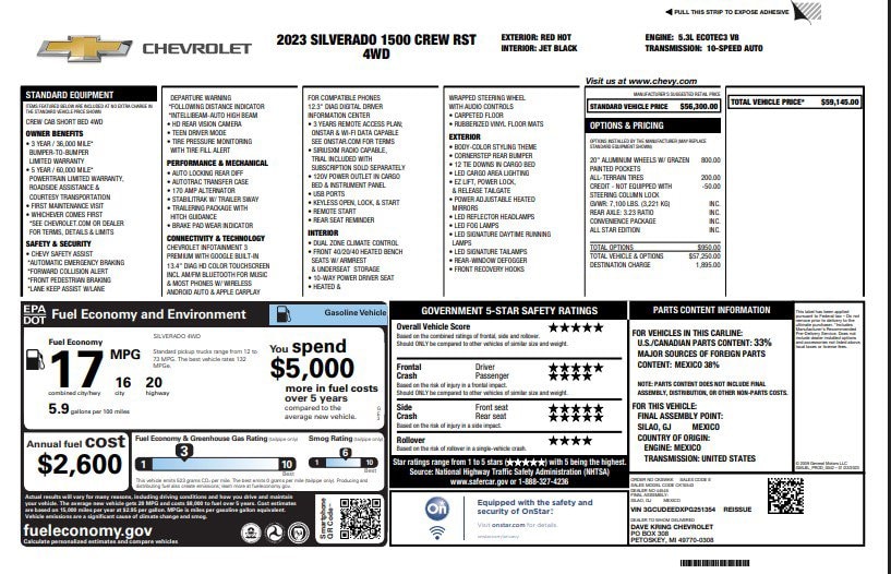 10-Way Power Driver Seat w/Lumbar, 12.3" Multicolor Reconfigurable Digital Display, 120-Volt Instrument Panel Power Outlet, 6-Speaker Audio System, All-Star Edition, Apple CarPlay/Android Auto, Auto High-beam Headlights, Auto-Locking Rear Differential, Automatic Emergency Braking, Automatic temperature control, Bluetooth® For Phone, Brake assist, Chevrolet Connected Access Capable, Color-Keyed Carpeting Floor Covering, Compass, Convenience Package, Deep-Tinted Glass, Delay-off headlights, Dual Rear USB Ports (Charge Only), Dual-Zone Automatic Climate Control, Electric Rear-Window Defogger, Electrical Steering Column Lock, Electronic Cruise Control, Electronic Stability Control, EZ Lift Power Lock & Release Tailgate, Following Distance Indicator, Forward Collision Alert, Front Frame-Mounted Black Recovery Hooks, Front LED Fog Lamps, Front Pedestrian Braking, Front Rubberized Vinyl Floor Mats, Fully automatic headlights, HD Rear Vision Camera, Heated Driver & Front Outboard Passenger Seats, Heated Power-Adjustable Outside Mirrors, Heated Steering Wheel, High Capacity Suspension Package, High Gloss Black Mirror Caps, Hitch Guidance, Inside Rear-View Mirror w/Tilt, IntelliBeam Automatic High Beam On/Off, Keyless Open & Start, Lane Keep Assist w/Lane Departure Warning, LED Cargo Area Lighting, OnStar & Chevrolet Connected Services Capable, Power driver seat, Power Front Windows w/Driver Express Up/Down, Power Front Windows w/Passenger Express Down, Power Rear Windows w/Express Down, Preferred Equipment Group 1SP, Rear 60/40 Folding Bench Seat (Folds Up), Rear Rubberized-Vinyl Floor Mats, Remote keyless entry, Remote Vehicle Starter System, SiriusXM w/360L, Speed-sensing steering, Standard Tailgate, Steering Wheel Audio Controls, Steering wheel mounted audio controls, Telescoping steering wheel, Theft Deterrent System (Unauthorized Entry), Tilt steering wheel, Trailering Package, Variably intermittent wipers, Wheels: 20" x 9" Painted Aluminum, Wireless Phone Projection, Wrapped Steering Wheel. CARFAX One-Owner.