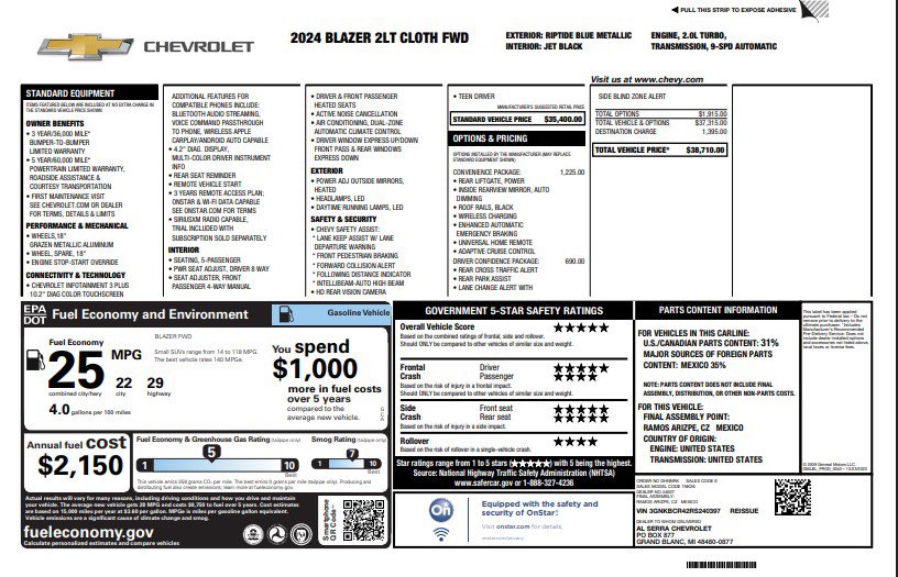 6-Speaker Audio System Feature, 8-Way Power Driver Seat Adjuster, Adaptive Cruise Control, Apple CarPlay/Android Auto, Auto High-beam Headlights, Automatic temperature control, Black Roof-Mounted Side Rails, Brake assist, Convenience Package, Delay-off headlights, Driver Confidence Package, Electronic Stability Control, Enhanced Automatic Emergency Braking, Front dual zone A/C, Fully automatic headlights, Heated door mirrors, Heated Driver & Front Passenger Seats, Inside Rear-View Auto-Dimming Mirror, Lane Change Alert w/Side Blind Zone Alert, Low tire pressure warning, Outside temperature display, Power door mirrors, Power Driver Lumbar Control, Preferred Equipment Group 2LT, Radio: Chevrolet Infotainment 3 Plus System, Rear Cross Traffic Alert, Rear Park Assist w/Audible Warning, Rear Power Programmable Liftgate, Remote keyless entry, Ride & Handling Suspension, SiriusXM w/360L, Speed-sensing steering, Steering wheel mounted audio controls, Telescoping steering wheel, Tilt steering wheel, Universal Home Remote, Variably intermittent wipers, Wheels: 18" Grazen Metallic Aluminum, Wireless Charging. CARFAX One-Owner. Clean CARFAX.