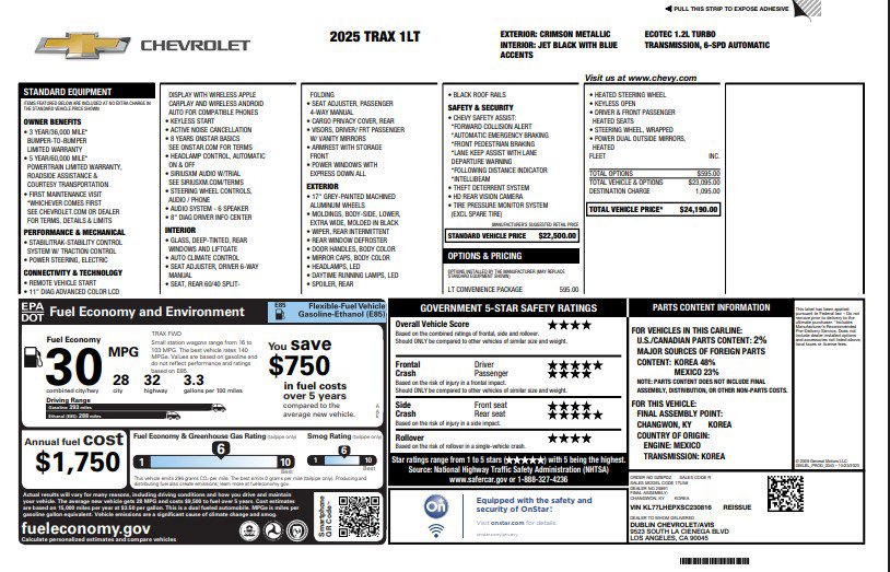 4-Way Manual Front Passenger Seat Adjuster, 6-Speaker Audio System Feature, 6-Way Manual Driver Seat Adjuster, Auto High-beam Headlights, Automatic temperature control, Brake assist, Delay-off headlights, Electronic Stability Control, Exterior Parking Camera Rear, Front Doors Keyless Open, Fully automatic headlights, Heated Driver and Front Passenger Seats, Heated Power-Adjustable Outside Mirrors, Heated Steering Wheel, Illuminated entry, LT Convenience Package, Preferred Equipment Group 1LT, Radio: AM/FM Stereo Audio System, Remote keyless entry, SiriusXM Trial Subscription, Steering wheel mounted audio controls, Telescoping steering wheel, Tilt steering wheel, Traction control, Variably intermittent wipers, Wheels: 17 Inch Gray-Painted Machined Aluminum Alloy, Wrapped Steering Wheel. CARFAX One-Owner. Clean CARFAX.