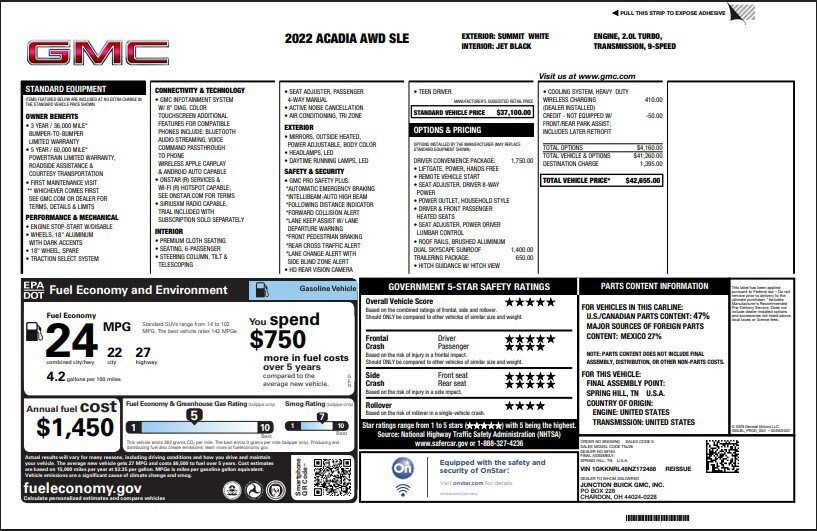 120-Volt Power Outlet, 4-Way Manual Driver Seat Adjuster, 4-Way Manual Passenger Seat Adjuster, 6-Passenger (2-2-2 Seating Configuration), 6-Speaker Audio System Feature, 8-Way Power Driver Seat Adjuster, Apple CarPlay/Android Auto, Auto High-beam Headlights, Automatic temperature control, Brake assist, Brushed Aluminum Roof Rails, Delay-off headlights, Driver Convenience Package, Dual SkyScape 2-Panel Power Sunroof, Electronic Stability Control, Four wheel independent suspension, Front dual zone A/C, Fully automatic headlights, Hands Free Power Programmable Liftgate, Heated door mirrors, Heated Driver & Front Passenger Seats, Heavy-Duty Cooling System, Power door mirrors, Power Driver Lumbar Control Seat Adjuster, Preferred Equipment Group 3SA, Radio: AM/FM w/8" Diagonal Multi-Touch Display, Rear air conditioning, Remote keyless entry, Remote Start, SiriusXM Radio, Speed-sensing steering, Steering wheel mounted audio controls, Telescoping steering wheel, Tilt steering wheel, Traction control, Trailering Assist Guidelines, Trailering Package, Universal Home Remote, Variably intermittent wipers, Wheels: 18" Machined Aluminum w/Dark Accents, Wireless Apple CarPlay/Wireless Android Auto. CARFAX One-Owner.