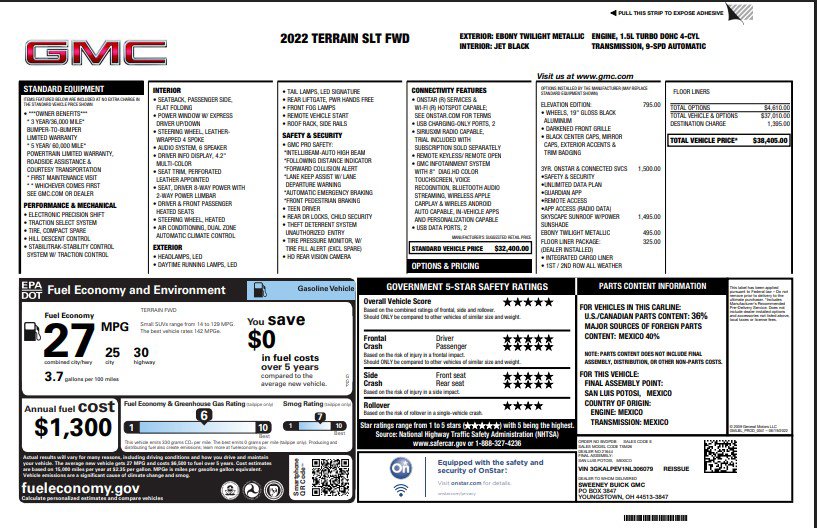 2 USB Data Ports, 2 USB Data Ports w/SD Card Reader, 6-Speaker Audio System Feature, 6-Way Power Front Passenger Seat, 8-Way Power Driver Seat Adjuster, Auto High-beam Headlights, Automatic temperature control, Black GMC Center Caps w/Red GMC Lettering, Black Mirror Caps, Bluetooth® For Phone, Brake assist, Darkened Front Grille, Delay-off headlights, Driver & Front Passenger Heated Seats, Electronic Stability Control, Elevation Edition, Floor Liner Package (LPO), Four wheel independent suspension, Front & Rear All-Weather Floor Liners (LPO), Front dual zone A/C, Front fog lights, Front Passenger 2-Way Power Lumbar, Fully automatic headlights, Garage door transmitter, Heated door mirrors, Heated steering wheel, Illuminated entry, Integrated Cargo Liner (LPO), Memory seat, Outside temperature display, Perforated Leather-Appointed Seat Trim, Power Driver Lumbar Control, Power Liftgate, Power passenger seat, Preferred Equipment Group 4SA, Radio: GMC Infotainment Audio System w/8" Display, Remote keyless entry, Roof-Mounted Luggage Rack Side Rails, SiriusXM Radio, Skyscape Power Sunroof w/Power Sunscreen, Speed-sensing steering, Steering wheel mounted audio controls, Telescoping steering wheel, Tilt steering wheel, Traction control, Variably intermittent wipers, Wheels: 19" x 7.5" Gloss Black Painted Aluminum, Wireless Apple CarPlay/Wireless Android Auto. CARFAX One-Owner. Clean CARFAX.