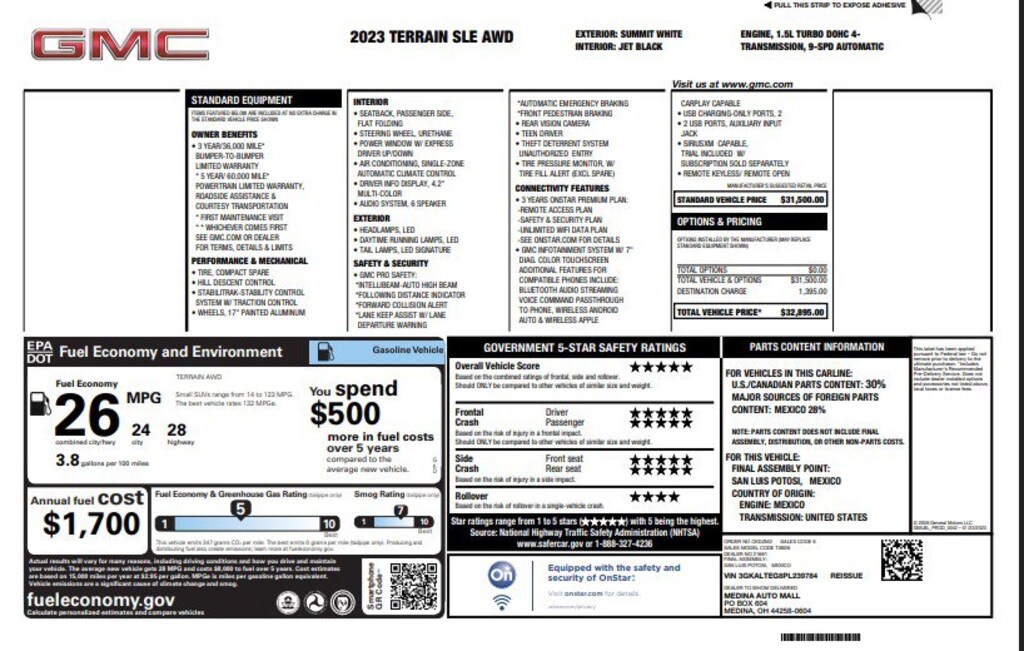 2 USB Data Ports w/Auxiliary Input Jack, 4.2" Multi-Color Driver Information Screen, 6-Speaker Audio System Feature, Auto High-beam Headlights, Bluetooth® For Phone, Brake assist, Delay-off headlights, Electronic Stability Control, Four wheel independent suspension, Fully automatic headlights, Heated door mirrors, Illuminated entry, Lane Departure Warning System, Power door mirrors, Preferred Equipment Group 3SA, Radio: GMC Infotainment Audio System w/7" Display, Rear window wiper, Remote keyless entry, SiriusXM Radio, Speed-sensing steering, Steering wheel mounted audio controls, Telescoping steering wheel, Tilt steering wheel, Traction control, Variably intermittent wipers, Wheels: 17" x 7" Silver Painted Aluminum, Wireless Apple CarPlay/Wireless Android Auto. Clean CARFAX.