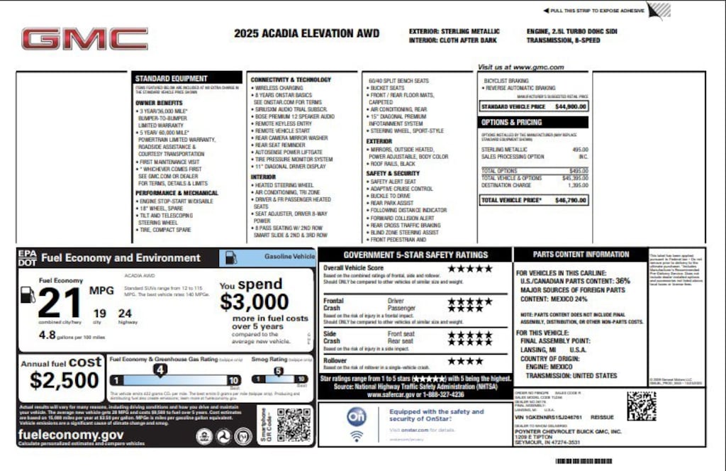 18" x 7.5" Aluminum Wheels, 2-Way Driver Power Lumbar Seat Adjuster, 4-Way Manual Front Passenger Seat Adjuster, 8-Passenger Seating (2-3-3 Seating Configuration), 8-Way Power Driver Seat Adjuster, Apple CarPlay/Android Auto, Auto High-beam Headlights, Automatic temperature control, Bose Premium 12-Speaker System w/Sub-Woofer, Brake assist, Delay-off headlights, Electronic Stability Control, Exterior Parking Camera Rear, Front dual zone A/C, Front fog lights, Fully automatic headlights, Heated door mirrors, Heated Driver & Front Passenger Seats, Heated steering wheel, Low tire pressure warning, Navigation System, Power Liftgate, Preferred Equipment Group 4SD, Radio: 15" Premium GMC Infotainment System, Rear air conditioning, Rear window wiper, Remote keyless entry, SiriusXM w/360L, Steering wheel mounted audio controls, Telescoping steering wheel, Tilt steering wheel, Traction control, Variably intermittent wipers. CARFAX One-Owner. Clean CARFAX.