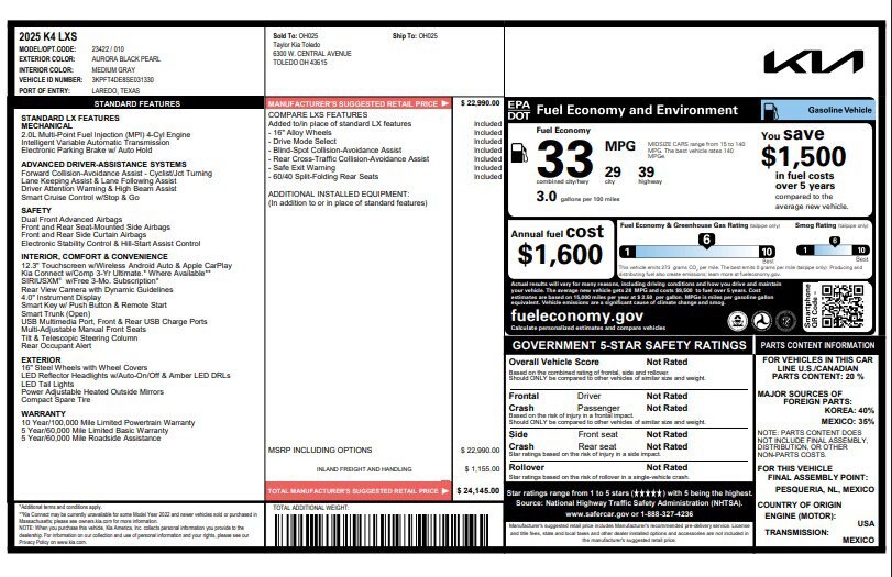 Full Safety Inspection done on every used car, includes Oil Change and topping off all fluids. 29/39 City/Highway MPG