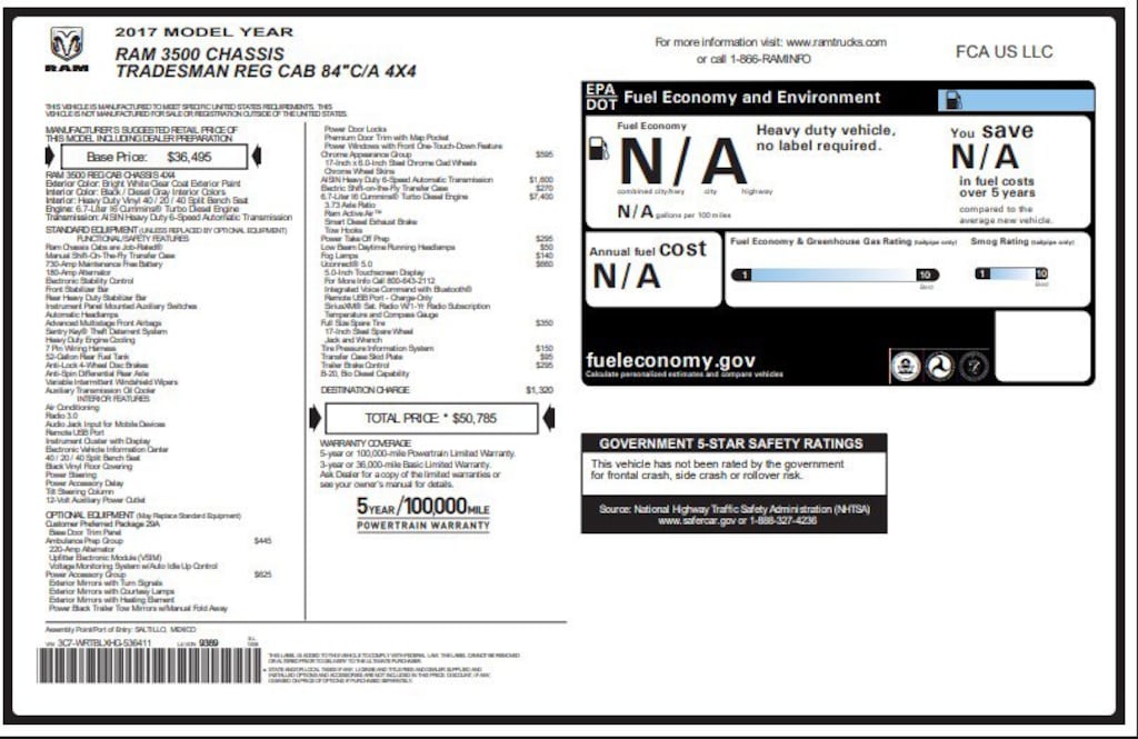 No Accidents, 6.7 Cummins Diesel, Ambulance Prep Package, Power Package, Flat Bed, 5.0" Touchscreen Display, Base Door Trim Panel, Bright Front Bumper, Bright Grille, Bright Wheel Skins, Chrome Appearance Group, Delay-off headlights, Dual rear wheels, Electric Shift-On-The-Fly Transfer Case, Electronic Stability Control, Exterior Mirrors Courtesy Lamps, Exterior Mirrors w/Heating Element, Exterior Mirrors w/Supplemental Signals, Fog Lamps, Front 1-Touch Down Power Windows, Front Wheel Spats, Fully automatic headlights, GPS Antenna Input, Integrated Voice Command w/Bluetooth, Low Beam Daytime Running Headlamps, Media Hub (USB, AUX), Power Accessory Group, Power Black Trailer Tow Mirrors, Power Locks, Premium Vinyl Door Trim w/Map Pocket, Quick Order Package 29A Tradesman, Radio: Uconnect 3 w/5" Display, Tilt steering wheel, Tire Pressure Information System, Traction control, Trailer Brake Control, Upfitter Electronic Module (VSIM), Variably intermittent wipers, Wheels: 17" x 6" Steel Chrome Clad. CARFAX One-Owner.